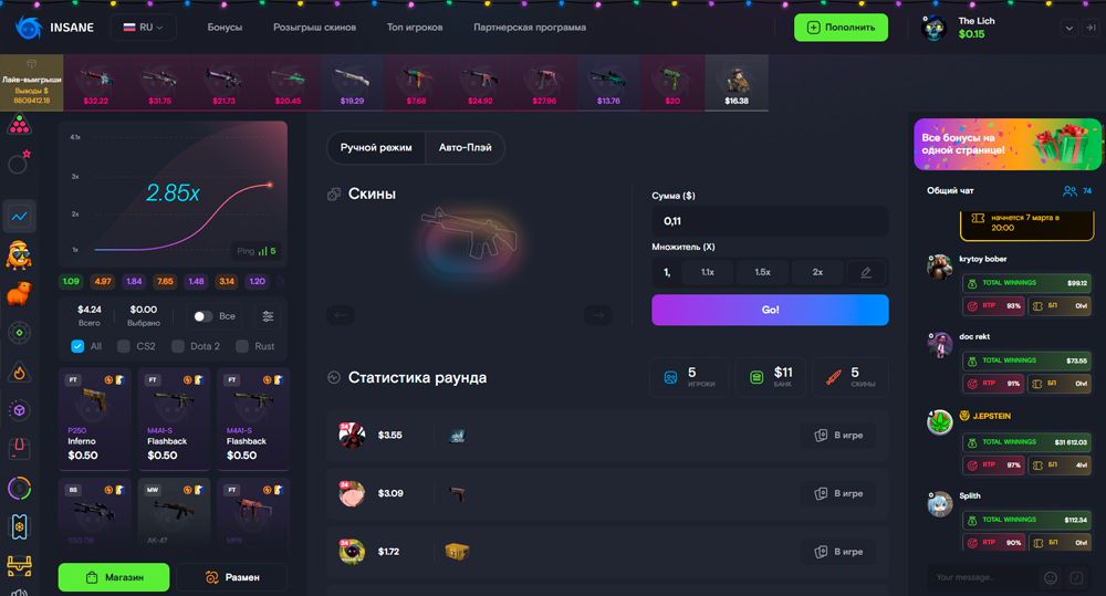 Insane ориентирован на игры с CS2-скинами и внутренним балансом, предлагая удобный интерфей. Одним из ключевых режимов на платформе является Crash, где игроки ставят на множители и пытаются выбрать оптимальный момент для вывода средств. Для новых и возвращающихся пользователей часто доступны бонусы и специальные предложения — например, промокод insane gl - DATAGAME — который даст дополнительные средства при пополнении, что делает знакомство с площадкой более выгодным.