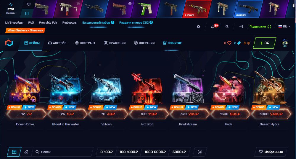 - Кейсы от блогеров — уникальные подборки от популярных стримеров и ютуберов.