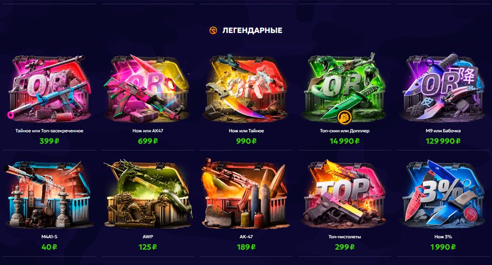 - Открытие кейсов – на сайте огромный выбор кейсов, разбитых по типам (легендарные, раритетные, фарм‑кейсы, подборки с персонажами, популярные, лимитированные, бюджетные, сборки блогеров, «Наши сборки» и ностальгические)Игроки могут изучать содержимое и шансы на выпадение до покупки