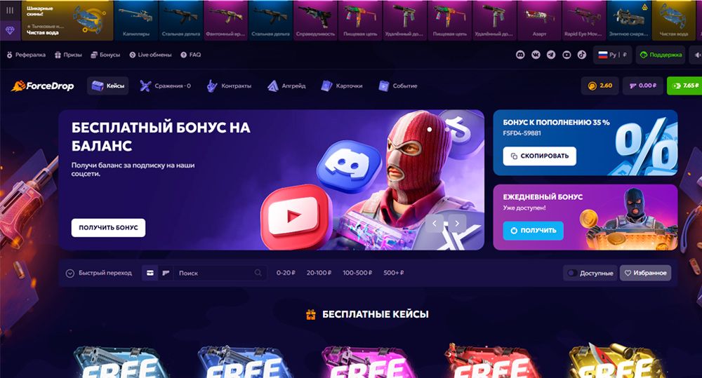 ForceDrop – популярный русскоязычный сайт, позволяющий открывать тематические кейсы CS2, участвовать в апгрейдах и контрактах. Интерфейс выполнен в тёмных тонах, на главной странице размещён полный каталог кейсов и текущие акции. Регистрация осуществляется через Steam; в профиле игрока отображается история и статистика игр